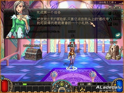 完成初始任务后,赛丽亚会带领你回到温馨美丽的赛丽亚旅馆。舒缓动听的背景音乐,暖紫色绚烂的灯光,富丽堂皇的装饰构造。这里是你每次登陆游戏的初始地点,接收信件的交流地点,存放道具的储存地点。身后站着美丽动人的赛丽亚,她会继续提醒教导你如何进行接下来的游戏任务。